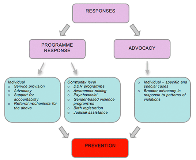 • In relation to the recruitment or use of children: community-level prevention of recruitment campaigns with community leaders, families, youth groups, schools, etc; advocacy for national legal reform in conformity with international legal standards, considering children as victims and ensuring their security; direct advocacy with the government and or offending parties to the conflict to advocate for immediate cessation of recruitment of children and release of children in their armed forces and groups.